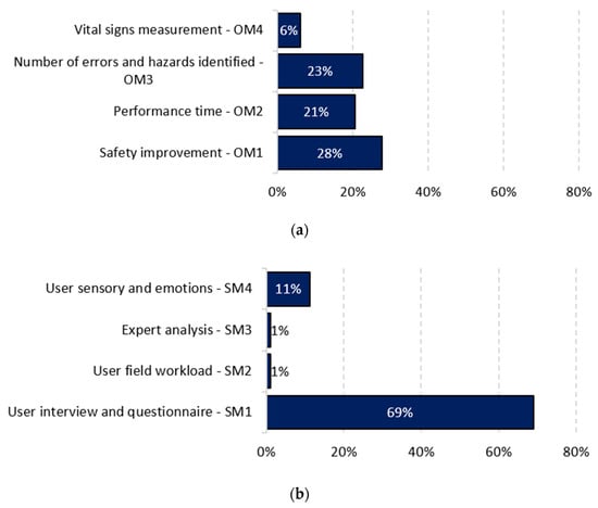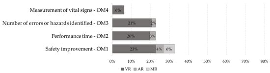 - OM4—Measurement of vital signs. This monitors the vital signs of participants by heartbeat, respiration, or perspiration, among others. These cases use tools, such as electrocardiograms or electroencephalography, to measure the physical response of the participant under various stressful circumstances or activities. Xu et al. [] used electromyography and a heart rate sensor to reveal instantaneous muscle strains caused by fear during VR training on fall prevention from height. Habibnezhad et al. [] used a Fitbit Versa health smartwatch, which measured the heart rate while performing activities at heights in an immersive VR environment. Another example is the research by Huang et al. [] and Jeon et al. [] where they used an encephalography system, and Huang et al. recorded the heart rate and blood pressure while simulating six major injury scenarios within the construction site. Kim et al. [] collected and analyzed biosignals from participants, such as electrodermal activity, pupil dilation, and saccadic eye movement. This type of assessment occurred in 6.2% of articles (six articles), particularly in VR. For AR and MR, no publications were identified.