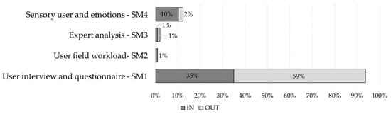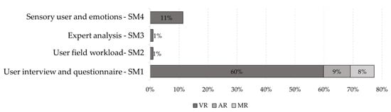 - SM3—Expert analysis. This indicator verifies the functionality and effectiveness of the experience through the opinion and critical analysis of experts. Professionals or experts can measure it by participating directly in the experience, observing the characteristics and performance of users within it, or participating in the design and parameterization of XR experiences. For example, experts could help determine the factors to be developed by technical managers and validate the technology, experience, and user behavior. Within the database, one article showed where expert analysis facilitated experience evaluation. Raimbaud et al. [] used AEC industry professionals to define the experience quality factors to evaluate. The study selected the following quality factors for evaluation: speed, information-gathering capability, ease of use, and spatial awareness. This type of evaluation occurred in 1% of items (one item), particularly in VR. For AR and MR, no publications were identified.