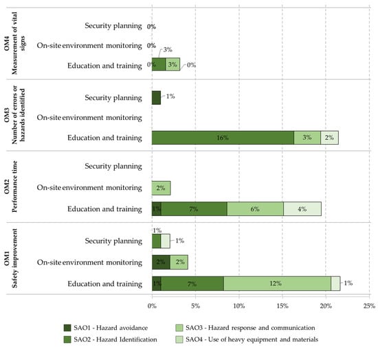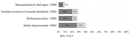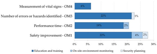 - OM1—Safety improvement. This consists of evaluating the correct behavior under specific circumstances that improves and ensures safety in the processes or activities within the construction site, for example, training to educate about the ideal posture when performing tasks and thus avoid accidents or diseases. In this case, the evaluation compares the postures of the participants within the practices and the recommended postures stored in the system database to deliver additional learning material if they are incorrect []. Another example is to monitor the site environment to avoid collisions or warn of approaching hazards. A case is evaluated by collecting live field data, filtering for unsafe situations, processing, and finally transmitting safety information in real time to a virtual reality. This information is then compared by including sensors to avoid accidents within the simulations, thus decreasing the number of unsafe situations to which workers are exposed [,]. Another case incorporates the warnings of proximity to hazards, and the decrease in accidents occurs within various case studies []. This type of evaluation seeks to quantify the safety of the construction site before and after the proposed experience, i.e., to verify the improvement or increase in safety compared to the non-use of the experience. Thus, Hasanzadeh et al. [] use three levels of protection in a roofing activity and evaluate how it affects the feeling of safety in the participants’ decision making, thus observing and comparing the level of safety in the different cases. This type of evaluation appeared in 27.8% of articles (27 articles). In addition, concerning the technologies, 22.7% used VR (22 articles), 4.1% used AR (4 articles), and 6.2% used MR (6 articles).