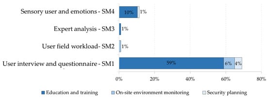 - SM4—Sensory user and emotions. This indicator focuses on identifying the emotions or sensations perceived by participants in dangerous situations or situations that could become unsafe or stressful for users. In some cases, the sensors and body trackers serve as measurement tools, such as sensors for gloves, arms, legs, and eyes, where the behavior or movements of the participants may vary during the experience. Habibnezhad et al. [] used body trackers to measure participants’ gait or movement and assess the fall risk. Other articles in the database perform hazard recognition by eye tracking of participants [,]. Additionally, within the literature, studies measure how sensations affect the safety and productivity of construction workers [,]. Other studies assess fear to determine low-risk behavior on elevated surfaces [,]. Fear induction can also be measured using electromyography, which measures the degree of emotional arousal []. Gao et al. [] measured workers’ personality traits, such as extroversion, agreeableness, conscientiousness, and neuroticism, to predict their safety behavior. This type of assessment appeared in 11.3% of items (11 items), all relating to VR.