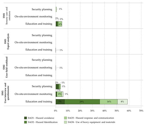 As mentioned in Section 3.2.3, the safety application objectives use our adaptation of the Frank Moore et al. article []. The following objectives are defined and implemented within the literature related to safety within construction. Figure 10 show the number of items of each safety application objective for each purpose related to the types of evaluation of the target method, and Figure 11 show the number of items of each security application objective for each purpose related to the types of evaluation of the subjective method.