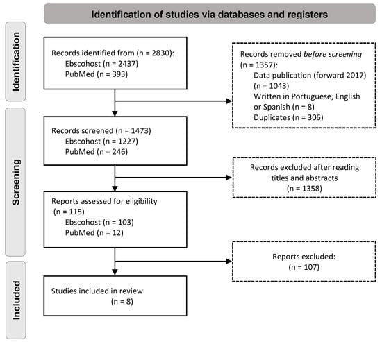 From the database search, 2830 articles were initially identified between the search years 2017 and 2022. From this total, 1357 articles were excluded, namely for being published prior to 2017 (n = 1043), for not being written in Portuguese, English, or Spanish (n = 8), or for being duplicate articles (n = 306). The remaining articles, a total of 1473, were screened based on title and abstract, resulting in the exclusion of 1358 articles. The remaining 115 articles were subjected to full-text reading, resulting in the exclusion of 107 using the exclusion and inclusion criteria. Thus, eight articles published between 2018 and 2022 met the defined inclusion criteria and were included in the review process. Figure 1 shows a schematic representation of the article selection process according to the PRISMA guide for reporting systematic reviews. Since the different studies stemming from the included articles varied in methodology, participants, and outcome measures, it was considered not to undergo meta-analysis.