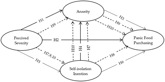 Recent research by Omar et al. [5] confirmed a full mediating effect of anxiety in the relationship between perceived severity and panic purchasing behaviour amid the COVID-19 pandemic. Despite the confirmation of the direct effects of perceived severity in self-isolation and panic purchasing amid the COVID-19 pandemic [6], the indirect effect is not yet confirmed. The current research takes this novel attempt to examine this indirect relationship. Drawn on the PMT [40], this research argues that perceived severity of COVID-19 food consumers for anxiety and their coping with self-isolation, which ultimatly affected their panic purchasing intentions. Therefore, people engage in unusual buying due to their anticipation of disrupted supplies or being forced to involuntarily stay at home for an unknown time, which leads to the purchase of products in large quantities that are of no use to them
