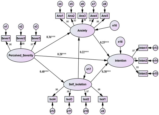 We adopted the statistical package for social science (SPSS) (v.25) with analysis of a moment structures (AMOS) for data analysis. We performed principal component analysis (PCA) to simplify high-dimensional data. We were able to confirm the unidimensionality of our variables, which were 55.216%, 51.670%, 50.331%, and 63.111% for perceived severity, anxiety, self-isolation intention, and panic food purchasing intention, respectively, of the total variance explained. We conducted Kaiser–Meyer–Olkin “KMO” to test the strength of the partial correlation between variables. The results showed that the values of KMO were more than 0.5 and close to 1, which meant that they were ideal [73]. The values were 815, 0.765, 0.881, and 0.805 for perceived severity, anxiety, self-isolation intention, and panic food purchasing intention 0, respectively. We were able to reject the null hypothesis, since the p value was 0.000. We adopted Cronbach’s Alpha to check the reliability of our measure. The findings of the Alpha were 0.991, 0.990, 0.916, and 0.898, respectively, confirming that the Alpha values were excellent [74].