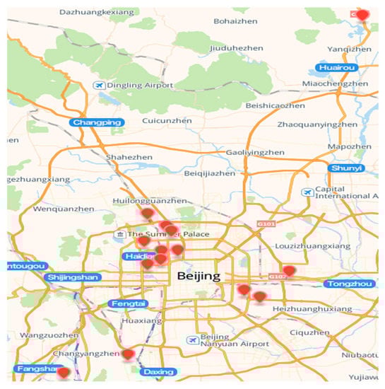 We sampled window films in 144 dormitories on 14 campuses of 13 universities in Beijing from May to December 2019. Figure 1 shows the sampling sites. Questionnaires were distributed to college students to gather information. This included basic information about their dormitory of residence, such as the university, building and dormitory number, room area, number of occupants, duration of occupancy and gender of occupants; dormitory interior decoration information, such as wall materials (emulsion paint and lime), floor materials (cement, tile, PVC boards and laminated wood), PVC wallpaper coverage and furniture materials (iron, MDF, leather and plastic) and quantity; the occupants’ living habits, such as the number of personal care products (liquid, milky, frothy and spray) per capita (fewer than 5 bottles, 5–10 bottles and more than 10 bottles) and frequency of use (never, 2–3 times per month, 2–3 times per week and at least one time per day), and frequency of use of cleaning products (washing liquid, sterilizing liquid and softener; 2–3 times per month, 2–3 times per week, and at least one time per day). A total of 230 questionnaires were issued, and the response rate was 84.3%. Then, the questionnaires were consolidated and sorted by dormitory as a unit. A total of 144 valid questionnaires were obtained.