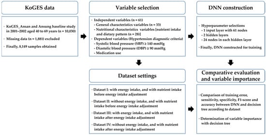 A flowchart for the research process is presented in Figure 1. From the KoGES baseline survey, a dataset consisting of 8149 samples with 61 independent variables and a class label, is obtained through variable selection. From the dataset, a DNN with experimentally selected hyperparameters are prepared. Then, four datasets are set according to the energy intake adjustment method, and a DNN is trained and evaluated for each dataset. A decision tree is used for comparative evaluation, and variable importance is analyzed using the decision tree.