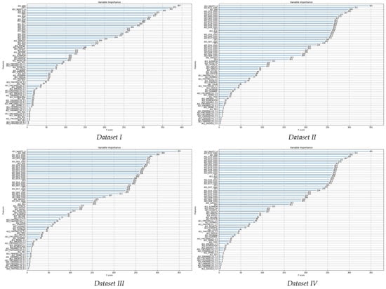 In dataset IV, waist circumference (variable importance = 345) showed the highest importance followed by zinc (variable importance = 311), BMI (variable importance = 299), niacin, nicotinic acid (variable importance = 295), tocotrienol (variable importance = 287), pyridoaxamine (variable importance = 277), calcium (variable importance = 273), fat (variable importance = 267), ash content (variable importance = 264), and carotene (variable importance = 264).