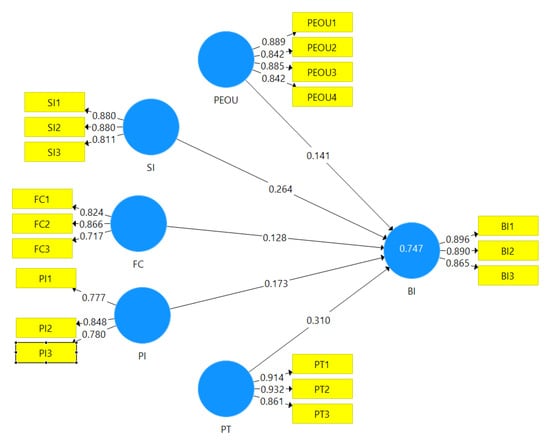 Figure 2 indicates that the coefficient of determination (R2) value of the model is 0.747, which is substantial. This means the explanatory power of the model is 74.7%. The model can explain 74.7% of healthcare sector patients’ behavioral intention to adopting fintech services.