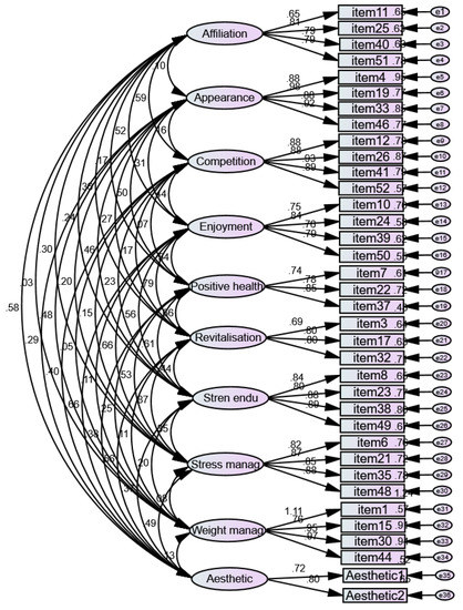 Validation of Questionnaire. The present survey was developed based on the relevant literature [1,44,97,102,103,104,105,106,107,108,109,110,111,112,113,114,115,116,117,118,119,120,121,122,123,124,125], particularly from validated questionnaires [109,110,115,120,122,123], well-known large-size studies/reports [107,118,120,124], and recognized literature of renowned authors [102,125]. Accordingly, participants were asked to respond mainly to single-choice items, multiple-choice items, and their preferences among several options (such items cannot be grouped to describe latent variables; therefore, no content, construct, or criterion-related validity could be assessed for them, and they should be individually considered when analyzing and interpreting the data). Part B Section 2 (Supplementary Material) of the questionnaire was developed using an existing and previously validated questionnaire, the Exercise Motivations Inventory (EMI-2; Figure 1) [109,122,123], and the German version is available from the official instrument website [126]. The version implemented in this work included 36 items grouped into 10 sub-scales: affiliation (4 items), appearance (4 items), competition (4 items), enjoyment (4 items), positive health (3 items), revitalization (3 items), strength and endurance (4 items), stress management (4 items), weight management (4 items), and aesthetics (2 items). Due to the characteristics of the EMI-2, confirmation of its structure was assessed for the data collected in our study. Confirmatory analysis was carried out with AMOS 22 software (IBM, Chicago, IL, USA) and aimed to test the validity of the 10-subscale model (Figure 1). The outcomes of the validation process showed optimal psychometric parameters (χ2 = 8710.399; df = 517; CFI = 0.95; SRMS = 0.505) in agreement with the recommendations made by Hu and Bentler, 1999, [127] on model fit assessment. Internal consistency for the ten subscales ranged from α = 0.765 to α = 0.942.