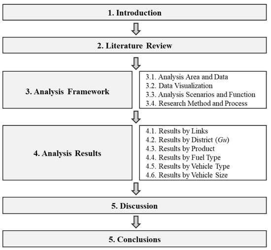 Figure 1 shows a flowchart depicting the processes adopted in this study to achieve the objectives listed above. In Section 2, previous studies related to eco-friendly vehicles and automotive exhaust gas emissions are reviewed, and the differences between this study and previous studies are examined. In Section 3, the analyzed data are examined, wherein scenarios are set, and the emission function is selected. An analysis method is then set for the scenarios’ verification, and an analysis process for emission calculation is constructed. In Section 4, the analyzed results for each scenario are presented, and the changes by region, fuel, product, and link in each scenario are examined. Finally, in Section 5, the significance of this study is discussed, and its policy-related and academic implications are proposed.