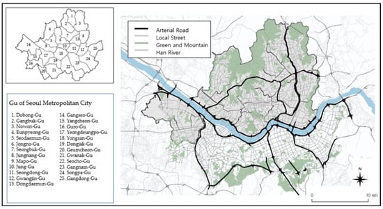 The target of this study is Seoul, which is the capital of Korea and the center of the country’s transportation activities. The total area of Seoul is 605.2 km2, but the area of land available for urban development is 371.54 km2 because the Han River flows through the city from east to west, and high mountains surround the city in the northern and southern areas. Owing to these topographical characteristics, many arterial roads exist in Seoul that efficiently connect the inner and outer parts of the city. They further connect these regions to regions beyond the river and mountains. Seoul comprises 25 autonomous districts and has an internal road network composed of arterial roads and local streets that facilitate transportation within the districts (Figure 2). Seoul is referred to as a vehicle-oriented city owing to its high density of automobile roads even though it is relatively small compared with large cities overseas [].