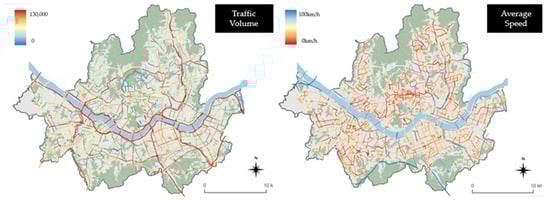 Before the analysis, the collected data were visualized. First, the traffic volume and vehicular travel speed data provided by View T 2.0 were visualized. These data are highly detailed transportation network data that correspond to the navigation digital map level 5 network, and information on Seoul is provided by using 8133 link units. Based on the traffic volume and vehicular travel speed data classified based on the link units, Figure 3 shows the annual average daily traffic (AADT) (left) and average vehicular speed (right) in Seoul. The AADT confirmed that the traffic volume is significant on the major arterial roads and main downtown areas in Seoul. The average vehicular speed in Seoul was found to be similar throughout the city, and urban highways had certain locations with high average speeds in each section (Figure 3).