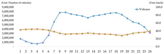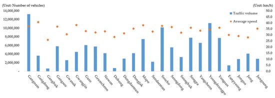 When the traffic volume and average travel speed were compared among the 25 autonomous districts in Seoul (Figure 4), Gangnam-gu, which is the main downtown area where traffic is concentrated, yielded the largest traffic volume, followed by Yeongdeungpo-gu and Seocho-gu. Gangbuk-gu yielded the smallest traffic volumes, followed by Dobong-gu and Eunpyeong-gu, as these districts are close to mountainous terrain. There was no significant difference in the average travel speed among the districts, but Gangbuk-gu yielded a significantly lower speed (25.9 km/h) compared with other areas. This appears to be because there is a great deal of mountainous terrain and no highways in Gangbuk-gu. When the traffic volume and average travel speed for each time period in Seoul were examined (Figure 5), the rush hours with the largest traffic volume were found to be 08:00 to 09:00 and 18:00 to 19:00, confirming that the traffic volume is the largest during the typical commuting hours in Korea. As the traffic volume increased in the time periods, the average travel speed decreased to some extent even though it did not decrease noticeably.