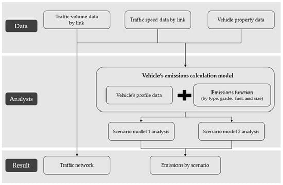 Emissions models are used for estimating emissions and are classified as microscopic and macroscopic models. Macroscopic models facilitate calculations using computers because data such as the average vehicular speed and traffic flow as a function of link and time period are used in such calculations, but they cannot consider detailed traffic characteristics affecting emissions (e.g., changes in speed, vehicular attributes, and time). Thus, the main analysis targets of macroscopic models are large areas, such as cities. Conversely, microscopic models provide high resolution because detailed data, including the vehicle’s type, age, and the individual vehicular speed in seconds, are used, but they are costly and relatively inefficient. Therefore, the scope of microscopic models is mostly limited to small areas [,]. Previous studies have used microscopic [,,,], macroscopic [,,], and combined models [,,,,,] in various ways depending on their purposes.