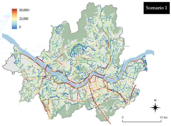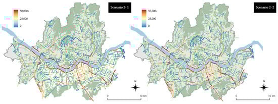 The results for scenarios 3-1 and 3-2 were calculated based on the link units. At the same legend level (as in the previous Figure 7 and Figure 8), the visual differences based on the link units were not significant, as shown in Figure 9. Similarly, scenarios 3-1 and 3-2 also showed no significant differences. These results, however, indicate that there was a very high-emissions reduction effect across the city compared with that in the previous scenario. Both scenarios 3-1 and 3-2 showed emissions ≤5000 g/km2, with the exception of the main arterial roads and urban highways of the city. Compared with scenario 3-1 (left side of Figure 9), scenario 3-2 (right side of Figure 9) yielded more links with blue scales indicating low emissions.