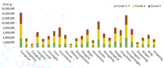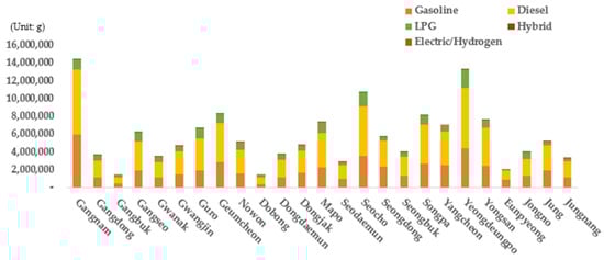 The emissions reduction effects associated with the application of scenario 2 were examined based on region, product, fuel, and vehicle type. First, the degree of reduction by district was examined because the proportions of vehicles are different for each district (Figure 14). When scenario 2-1 was compared with scenario 1, Eunpyeong-gu showed the highest emissions reduction effect, followed by Gangnam-gu and Seongdong-gu, while Dongdaemun-gu yielded the lowest effect (left side of Figure 12). In Eunpyeong-gu, which exhibited the largest emissions reduction effect in the case of scenario 2-1, the proportions of diesel and LPG vehicles that correspond to grades 4 and 5 were found to be 0.7% and 2.4% higher, respectively, than the average proportions in Seoul. It appears that Eunpyeong-gu exhibited the highest reduction effect following the replacement of old vehicles of grades 4 and 5 because the proportion of people aged ≥60 years (25.4%) is higher than the average proportion in Seoul (23.5%) []. While there was a difference of approximately 0.94%p between the district that exhibited the maximum emissions reduction (Eunpyeong-gu 5.97%) and the district that exhibited the minimum reduction (Dobong-gu 5.03%), the average emissions reduction effect of Seoul was found to be 5.22% (compared with that associated with scenario 1) (Table 1).