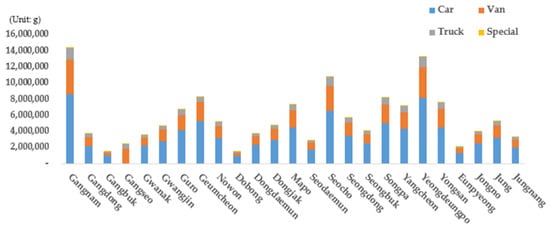 The emission results were then evaluated based on the district and type of vehicle (Figure 12). Cars yielded the highest emissions among all the types of vehicles. The proportions of emissions from each type of vehicle in Seoul were found to be 60.9% for cars, 28.7% for vans, 9.9% for trucks, and 4.2% for special vehicles. Cars and vans had the largest proportion among all vehicles, followed by trucks and special vehicles owing to the urban characteristics of Seoul. Meanwhile, trucks were associated with the smallest number of registrations, but their emissions were the highest after those associated with cars and vans. This is because trucks produce high levels of emissions, indicating that emissions from trucks cannot be neglected.