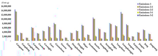 The data calculated based on the link units were combined for each autonomous district to examine vehicular emissions based on the district in each scenario (Figure 11, Figure 12 and Figure 13). First, when emissions from each autonomous district were examined in scenario 1 (the no-action alternative), Gangnam-gu, Yeongdeungpo-gu, and Seocho-gu exhibited the highest vehicular emissions. These results are similar to the traffic volume results (classified based on the district in Figure 4) because these areas have the largest traffic volumes in Seoul. The traffic volume of Geumcheon-gu, however, was not large compared with other areas, even though its emissions were the highest after those of Gangnam-gu, Yeongdeungpo-gu, and Seocho-gu (refer to Figure 4). Therefore, the emissions for each district were subdivided based on the grade and vehicle and fuel types, and more detailed vehicle emissions were calculated based on considerations of various vehicular characteristics.