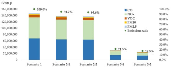 When the results of scenario 2 were evaluated by product based on scenario 1 (Figure 15 and Table 2), CO (Carbon Oxide) exhibited the largest proportion of total emissions followed by NOx (Nitrogen Oxide), VOC (Volatile Organic Compounds), PM10 (Particulate Matter 10), and PM2.5 (Particulate Matter 2.5). In the cases of scenarios 2-1 and 2-2, it was found that the proportions of emitted products were not changed significantly compared with those associated with the existing scenario. When the reduction rate was examined for each scenario, NOx exhibited the highest reduction rate (5.57%), while CO yielded the lowest reduction rate (5.02%) in scenario 2-1 (Table 2). CO is emitted from gasoline vehicles, while NOx is emitted from diesel vehicles. In the case of gasoline vehicles, the emission level for each grade is lower than that of diesel vehicles. The emissions from diesel vehicles significantly increase as the vehicles become older. Therefore, the analyzed results indicate that replacing diesel vehicles was more effective at reducing emissions than replacing gasoline vehicles of grades 4 and 5 with eco-friendly vehicles. Unlike scenario 2-1, scenario 2-2 exhibited the highest VOC reduction rate (9.28%), thus indicating that more VOC are emitted from old vehicles compared with other substances. In addition, because PM10 and PM2.5 are emitted only from diesel vehicles owing to their characteristics, reducing the number of diesel vehicles first is an effective alternative to the reduction of PM emissions.