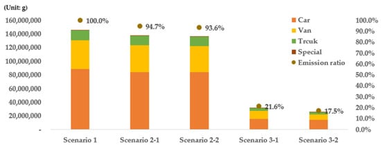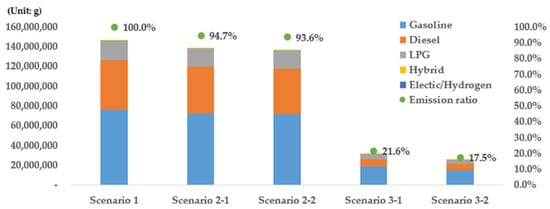 The emissions for each fuel type and the reduction effects in the cases of scenarios 2 and 3 were examined based on scenario 1 (Figure 16 and Table 3). Among the total emissions, gasoline vehicles exhibited the largest proportion, followed by diesel, LPG, and hybrid vehicles. In the case of the existing scenario 1, the proportion of each type of vehicle in total emissions was found to be 52.1% for gasoline vehicles, 34.5% for diesel vehicles, 13.2% for LPG vehicles, and 0.2% for hybrid vehicles. These proportions did not change in scenarios 2-1 and 2-2. In scenario 2-1, diesel vehicles exhibited the highest emissions reduction effect (6.64%) followed by hybrid vehicles (5.95%), gasoline vehicles (4.79%), and LPG vehicles (3.77%). These results indicate that among the vehicles registered in grades 4 and 5, diesel vehicles exhibited the highest emissions reduction effect. In the case of scenario 2-2, diesel vehicles also yielded the highest emissions reduction effect (8.21%), followed by hybrid (6.31%), gasoline (6.13%), and LPG vehicles (2.56%). It should be noted that scenario 2-2 showed emissions from LPG vehicles and had a lower reduction rate compared with scenario 2-1. This is because the number of grade-5 LPG vehicles is smaller compared with those of grades 1 to 4 as they have shorter lifespans than vehicles that use other fuel types owing to their nature. Therefore, unlike other vehicles, replacing vehicles of grades 4 and 5 was found to be more effective for reducing emissions than replacing only vehicles of grade 5 with respect to LPG vehicles.