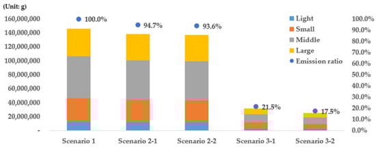 When the emissions results concerning the vehicles’ sizes were examined (Figure 18 and Table 5), middle-sized vehicles exhibited the highest emissions ratio (23.1%) in the case of scenario 1 followed by large vehicles (27.2%), small vehicles (23.1%), and compact vehicles (8.5%). This appears to be because the number of middle-sized vehicles is larger than those of vehicles of other sizes. When the emissions reduction effect was examined based on this fact, large vehicles yielded the highest reduction rate (5.63%) in the case of scenario 2-1, followed by middle-sized vehicles (5.52%), compact vehicles (4.94%), and small vehicles (4.62%). In the case of scenario 2-2, however, middle-sized vehicles yielded the highest reduction rate (6.86%) followed by large vehicles (6.2%), small vehicles (6.09%), and compact vehicles (5.34%). The results of scenarios 2-1 and 2-2 can be interpreted as follows. Large vehicles yielded the highest reduction effect in the case of scenario 2-1 and middle-sized vehicles in the case of scenario 2-2 because the proportion of middle-sized vehicles is the highest for grade 5 and that of large vehicles is highest for vehicles with grades 4 and 5 based on the total registered motor vehicles statistics in Seoul. As emissions from large vehicles increase as their age increases, the reduction effect will be high if these vehicles are replaced with eco-friendly vehicles. Based on these results, it was confirmed that replacing larger vehicles first with eco-friendly vehicles is effective for reducing emissions.