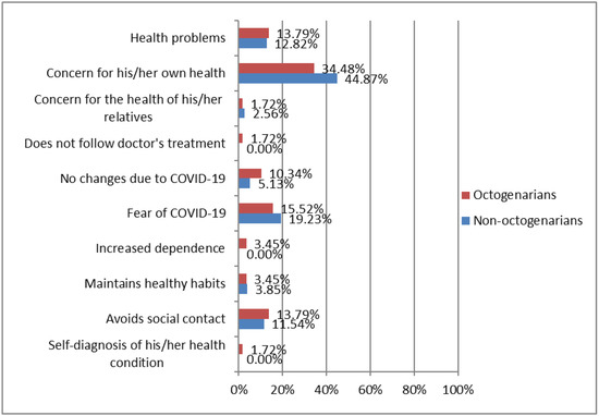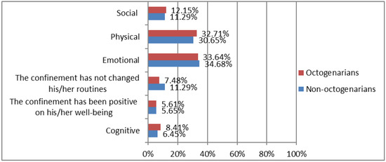 Regarding well-being, the 52.50% of the sample considered that COVID-19 altered their well-being to a great extent. Figure 1 shows differences between octogenarians vs. non-octogenarians in alterations in well-being caused by COVID-19 confinement. Alterations in emotional factors stand out in both groups, according to participant 45: “because it is very scary that people dye because of COVID-19. Our life has changed because we can’t go calmed down the street, nor when we meet family or friends” and participant 5: “I started teleworking and it has been overwhelming because we had more work than ever”. Moreover, physical alterations were highlighted, as participant 3 stated: “regarding physical level, I get more tired when making any effort”. It should be noted that non-octogenarians reported that confinement had less impact on their habits, as indicated by participant 164: “the confinement seemed very good to me because I don´t usually go out and I am with my husband and my daughter, so it is fine for me” and participant 133: “regarding confinement, I could climb stairs as I did before”.