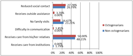 On the other hand, 30% of the individuals reported that social support decreased during confinement. Figure 2 shows differences between octogenarians vs. non-octogenarians in changes in social support during COVID-19 confinement. In this regard, the most important change in octogenarians was the increase of care provided by their relatives, as shown by participant 1: “my family members are much more concerned about me and about the fact that I comply with the treatments” and participant 63: “I am living with my daughter, because due to confinement, I needed her help and care and I did not want to be alone”. In contrast, non-octogenarians perceived they did not received care during confinement from physicians, or they did not receive enough information in this regard; according to participant 187: “No doctor has come to my house to give information to me regarding suggestions of care and aspects to take into account related to confinement“ and participant 156: “I have not received any support”.