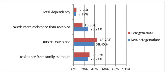 Regarding assistance needs of HF patients, 60% of individuals in the sample were not satisfied with the assistance received. As shown in Figure 4, both groups needed assistance, with a greater predominance in octogenarians, as reported by participant 1: “I have a 24-h caregiver, she runs all my errands, goes shopping, helps me in the bath, checks my pills” and participant 23: “another caregiver to clean the house and go shopping”. On the other hand, non-octogenarians considered that they needed more help than they received, as reported by participant 19: “I need more attention because my legs that are swelling more, and I don’t understand why” and participant 229: “the doctor is more available. The general practitioner does not take care of me, he only gives medication to me, we cannot go to the outpatient clinic”.
