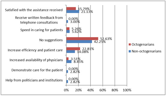 Differences between octogenarians vs. non-octogenarians in suggestions to improve care during COVID-19 confinement. Octogenarians (≥80 years; n = 53). Non-octogenarians (<80 years; n = 67).