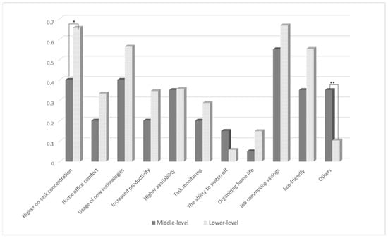 Remote work benefits perceived by lower- and middle-level managers. Notes. * p < 0.05; ** p < 0.01.