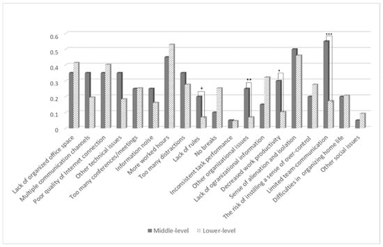 Remote work limitations, perceived by lower- and middle-level managers. Notes. * p < 0.05; ** p < 0.01; *** p < 0.001; + p < 0.10.
