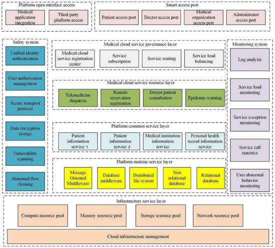 In Figure 1, the system architecture of the smart medical cloud service platform includes six layers: access, medical cloud service governance, medical cloud service resource, platform public service, platform runtime service, and infrastructure. In addition, the system also includes the overall security and monitoring system of the platform.