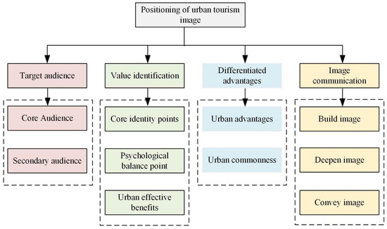 The city tourism image is positioned from four angles. 1. The target group should be identified: the travel brand [26]. The main and auxiliary crowd of the city should be caught. 2. Through the analysis of the basic identity of the audience, the audience is deeply excavated. 3. The core competitiveness of urban tourism brands is established, and the similarities and advantages of similar cities are compared with other similar cities. 4. The city image is divided into four aspects: target audience, value recognition, difference advantage, and image communication [27]. Figure 3 shows the positioning connotation of the urban tourism image.