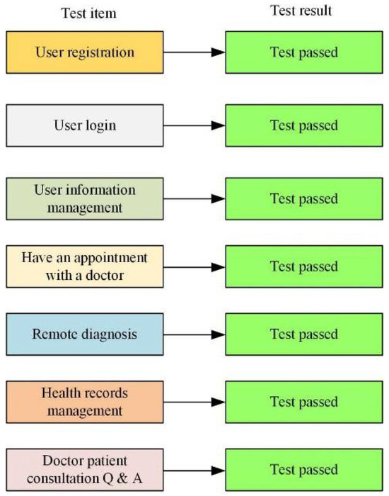 The functions of the smart medical platform are mainly realized through the client interface of the smart medical system network to ensure the various functions required and the use of users. Since smart medical services serve different users, clinical trials are carried out on PC and tested on smart medical platforms. Here, a PC platform is taken as an example. The main problems on the mobile phone side are the performance of web pages and the usage habits of users. The main functions and services of the Smart Healthcare Cloud are tested, as shown in Figure 6.