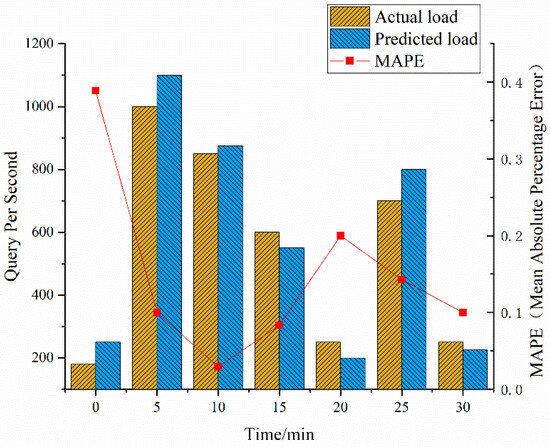 In Figure 7, the predicted load values (predicted query rate) of 0 min, 5 min, 10 min, 15 min, 20 min, 25 min, and 30 min are 250, 1100, 875, 550, 200, 800, and 225, respectively; the actual load values (actual query rate) are 180, 1000, 850, 600, 250, 700, and 250. The calculation shows that the Mean Absolute Percentage Error (MAPE) at 0 min, 5 min, 10 min, 15 min, 20 min, 25 min, and 30 min are 38.89%, 10.00%, 2.94%, 8.33%, 20.00%, 14.29%, and 10.00%, respectively. The conclusion shows that from 0 min to 30 min, the load value changes dynamically. The load value is the highest at 5 min, and the mean absolute percentage error is the smallest at 10 min.