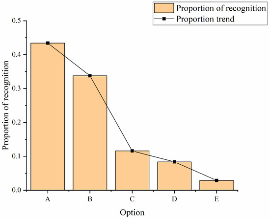 Respondents’ recognition of Chengdu city’s tourism image positioning (drawn according to the test results after research and design combined with data). (A: very representative; B: certain characteristics; C: Chengdu city’s positioning feels average and not brilliant; D: Chengdu city’s positioning does not match local characteristics; E: I don’t quite understand the positioning of Chengdu city).