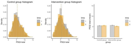 Distributions of pre- and post-intervention PSQI total scores in the two groups. Note. PSQI = Pittsburgh Sleep Quality Index. Time 1 refers to enrolment date; time 2 refers to study end date. The error bars in the bar plot refer to standard errors.