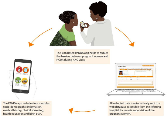 - Benski, A.C.; Stancanelli, G.; Scaringella, S.; Herinainasolo, J.L.; Jinoro, J.; Vassilakos, P.; Petignat, P.; Schmidt, N.C. Usability and feasibility of a mobile health system to provide comprehensive antenatal care in low-income countries: PANDA mHealth pilot study in Madagascar. J. Telemed. Telecare 2017, 23, 536–543. [Google Scholar] [CrossRef] [PubMed]