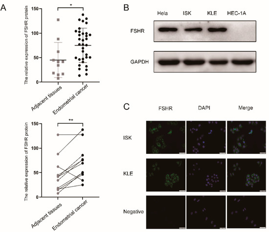 Expression of FSHR in EC tissue and cell lines. (A) Detection of the expression of FSHR in EC tissues and adjacent tissues by IHC. In the formula , PI is the proportion of positive cells among all cells in the section and I corresponds to the color intensity of a section. (B) FSHR was detected by Western blot (WB) in the Hela cell line, as well as the ISK, KLE, and HEC-1A cell lines, and they were normalized with GAPDH. (C) The expression of FSHR in KLE and ISK was detected by IF. * p < 0.05, ** p < 0.01.