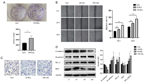 Effects of different doses of FSH on cell proliferation and migration in ISK. (A) Cells were treated with 100 IU/L FSH for 10 days and calculated. (B) Cells were treated with different doses of FSH (0 IU/L, 50 IU/L, and 100 IU/L) for 48 h, then cell migration rates were detected by cell scratch experiments at 24 h and 48 h using a (C) Transwell migration assay at 48 h. (D) E-cadherin, N-cadherin, BCL-2, and BAX protein levels were measured with WB, and GAPDH was the control. Relative band intensities were used to quantify E-cadherin, N-cadherin, BCL-2, and BAX protein expression levels. Data are expressed as means ± SDs. * p < 0.05, ** p < 0.01.