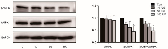 The effect of FSH on AMPK in Ishikawa cells. (Left) AMPK and pAMPK (Thr172) protein levels were detected by WB. (Right) Relative band intensities were used to quantify the level of AMPK and pAMPK (Thr172) protein expression. Data are expressed as means ± SDs. * p < 0.05.