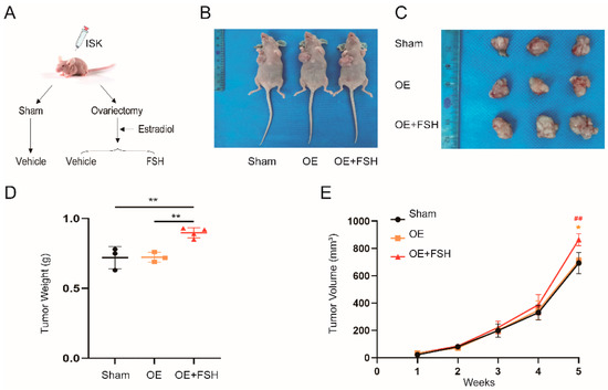 Effect of FSH on the neoplasia of endometrial cancer in nude mice. (A) Process diagrammatic drawing of BALB/c mice receiving different treatments. After acclimatization for one week, ISK cells were injected into the left axilla (approximately 1 × 107/0.2 mL) of the mice. Three groups of mice were randomly assigned: (1) sham surgery (sham), (2) bilateral ovariectomy (OVX) with dietary estradiol (E2) supplementation (OE), and (3) OVX plus E2 with FSH (30 IU/(kg, d)) (OE plus FSH). Group (1) received a vehicle injection and was used as the control. Group (2) was given desiccated E2 powder (2.6 ppm) as a hormone replacement diet supplement to eliminate the impact of E2. Group (3) received FSH intravenously and daily for two weeks until (B) the mice were killed. (C) Tumors from the mice were collected and (D) weighed. (E) Weekly growth curves of the tumors and tumor volumes. The formula used was: . Data are expressed as means ± SDs. ** p < 0.01 and * p < 0.05 versus the sham group, and ## p < 0.01 versus the OE group.