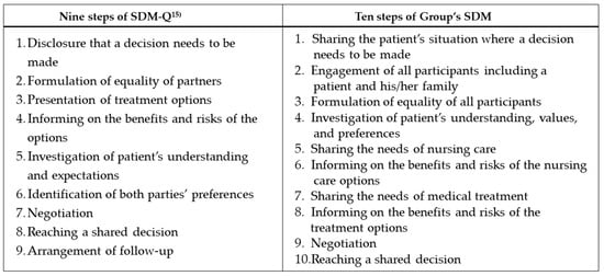 In Japan, it is crucial to communicate goals, identify problems, and reach consensus through conversation to enable professionals with different specializations, such as medical and nursing care, to work together as a team []. Therefore, the authors integrated the issues related to multiple Japanese professional collaboration and team formations with the SDM concept; this concept was then considered by the research group while developing the Group’s SDM measure.