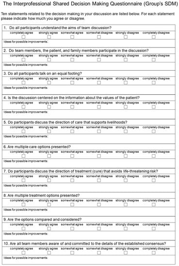 In this study, the authors (YG, HM) identified the elements needed to assess interprofessional SDM theoretically based on SDM-Q. As background for creating this measure, a team of multidisciplinary professionals was required to support a complex and difficult decision-making process [,,]. The authors designed the interprofessional SDM measure based on the assumption that multidisciplinary professionals will understand that SDM is carried out by a small team comprising a patient and professionals and that professionals who have learned the skills required for such SDM will be involved in providing support to patients and their families in making decisions during complex and difficult situations.