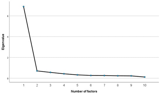 The Group’s SDM measure data were analyzed using factor analysis (primary axis method; promax rotation). The resulting KMO value was found to be 0.935, which indicated the appropriateness of the sample size. As Bartlett’s test of sphericity yielded an approximate χ2 value of 1510.044 (degree of freedom: 45, p < 0.001), we considered that a correlation exists between the items. A scree plot yielded one factor, suggesting a single-factor structure (Figure 3).