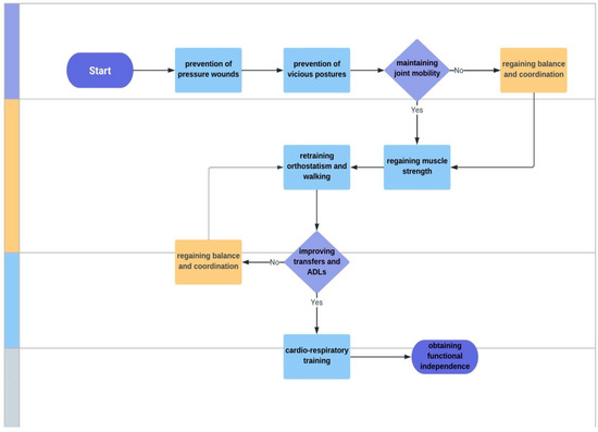 The main objectives of the rehabilitation treatment were: (1) prevention of pressure wounds; (2) prevention of vicious postures; (3) maintaining joint mobility; (4) regaining muscle strength, (5) retraining orthostatism and walking; (6) improving transfers and ADLs; (7) cardio-respiratory training; (8) obtaining functional independence; and (9) improving quality of life (Figure 2). The rehabilitation treatment was individualized based on joint mobility, muscle strength, balance, coordination, and gait.