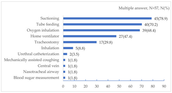 Respondents could choose multiple answers for the medical devices and procedures required for the patients. Overall, 47 patients (78.9%) required tracheal suctioning, 40 (70.2%) required tube feeding, and 39 (68.4%) oxygen inhalation. Figure 1 shows the medical devices and procedures required by these patients.