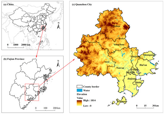 Quanzhou is located on the southeast coast of China (117°25′–119°05′ E, 24°30′–25°56′ N) and is one of the central cities on the west coast of the Taiwan Strait. It is also a modern industrial, trade, and port city. Counties and urban areas in Quanzhou City, including Quangang, Licheng, Fengze, Luojiang, Jinjiang, Shishi, Nan’an, Dehua, Anxi, Hui’an, and Yongchun, were thus selected as the study area (Figure 1). The study area contains scattered hills, valleys, and basins, with the elevation decreasing from the northwest to the southeast. Quanzhou has an area of 11,015 km2, with mountains and hills accounting for about four-fifths of the total area. Quanzhou has a subtropical marine monsoon climate, with an average annual temperature of about 20.3 °C and an average annual rainfall of about 1700 mm.