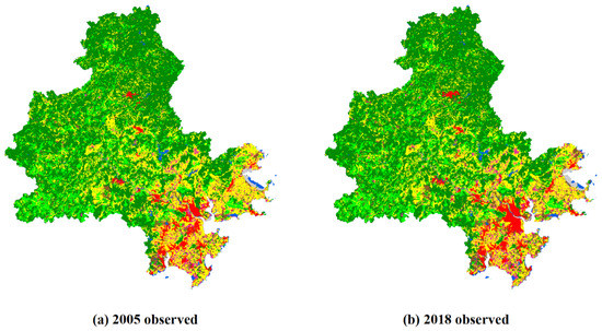 To test the simulation of the PLUS model, the land use map and driving forces of Quanzhou in 2005 are input into the LEAS module to determine the probability of developing different land use types. In the random forest algorithm of the LEAS, the sampling rate is set to 0.05, the number of regression trees is 20, mTry = 9, and the number of threads is four. Furthermore, the CARS parameters such as neighborhood weight, moving window size, cost matrix, and land demand are set to simulate the spatiotemporal evolution dynamics of land use in 2018 when the percentage of seeds was 0.0001 (Figure 2). The simulation results are compared with the observational data for the years 2005 and 2018, and we calculate the accuracy indicators for the simulation such as overall accuracy, Kappa coefficient, and FoM. The results show that at a sampling rate of 0.05, the overall accuracy and the Kappa coefficient reach 91.77% and 0.878, respectively, which suggests that the simulation results of the PLUS model for the spatial distribution of land use in Quanzhou in 2018 are extremely accurate, so this model can be used to predict future land use.