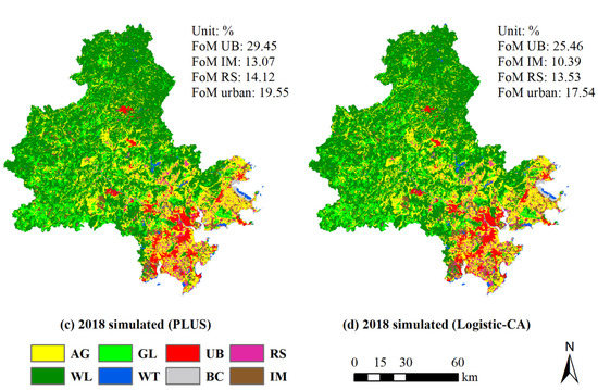 We evaluate the accuracy of PLUS simulations based on the overall accuracy, Kappa coefficient, and figure of merit (FoM). The overall accuracy is the percent of pixels correctly simulated [46]. The Kappa coefficient serves to test whether one map differs statistically from another map (rather than simply reporting this value as another measure of accuracy) [47]. The FoM, such as the intersection over union for multiple classes, is computed by superimposing the initial land use map in 2005, the actual map in 2018, and the simulated map in 2018. The formula of the FoM is